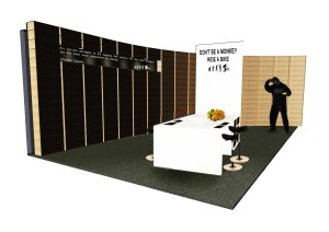 De stand is opgebouwd uit bananendozen die door hun plaatsing uitnodigen om door de stand te lopen.