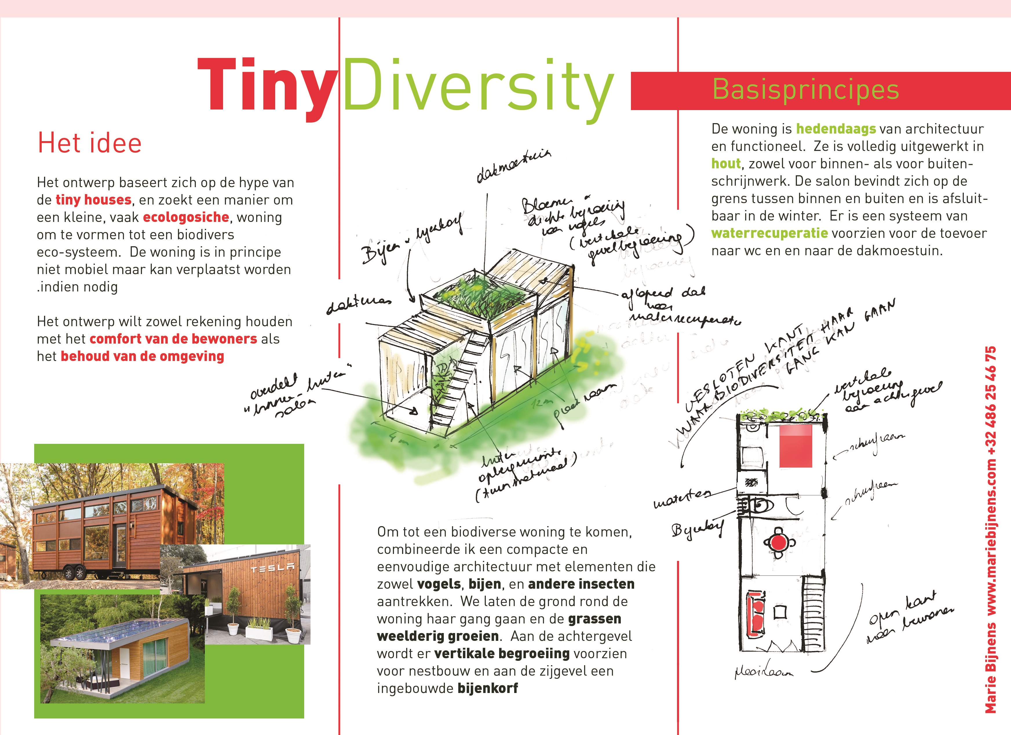 TinyDiversity is een ecologisch ontwerp voor een “Tiny House” (of simpelweg kleine woning). Met deze tiny house wil ik zo weinig mogelijk de omgeving waarin ze geplaatst wordt verstoren en tevens een poging doen om de natuur dankzij deze woning nog extra kansen te bieden. Het ontwerp is zo opgebouwd dat het beoogt om de biodiversiteit in de omgeving van de woning aan te trekken en aan te moedigen.