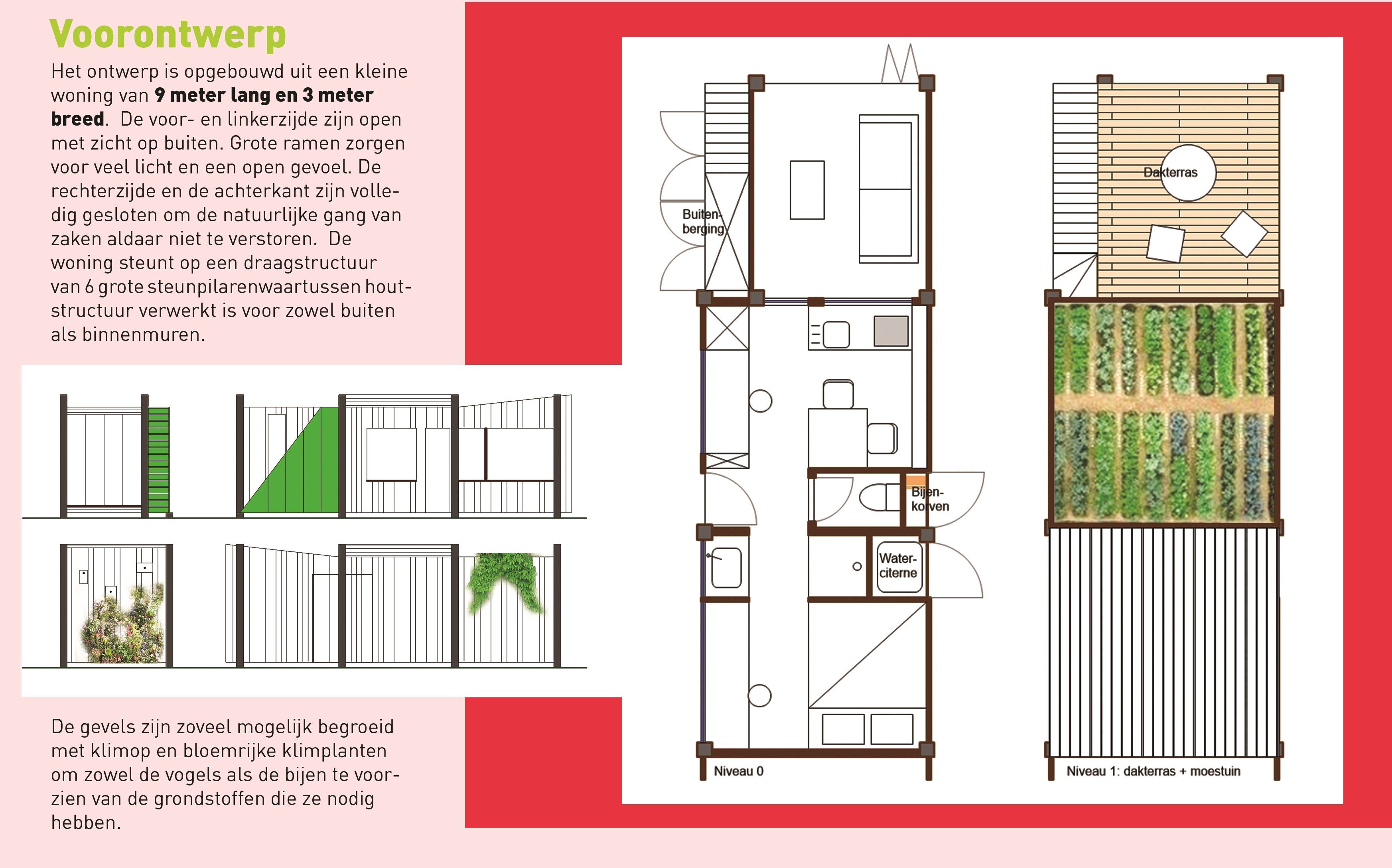 Echter, mens en dier hebben andere levenswijzen en om te zorgen dat elk ongestoord kan leven, heb ik de woning zo ontworpen dat twee van de vier gevels (de achter en rechterzijgevel) helemaal gesloten zijn. Aan de achterzijde wonen de bijen, op de rechtergevel wonen de vogels. Rondom groeien het gras en de bloemen weelderig. De voorgevel en linker gevel zijn dan weer helemaal bedacht vanuit het comfort van de bewoners. Ze zijn voorzien van grote ramen en de salon bevindt zich zowel binnen als buiten afhankelijk van de weersomstandigheden. Het raam tussen de salon en buiten kan namelijk helemaal opengevouwen worden.